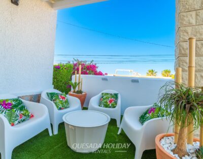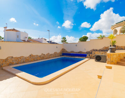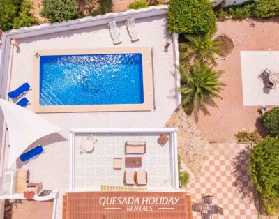 An attractive and spacious high standard Villa with a private swimming pool and garden overlooking the residential area of Quesada and fabulous panoramic views over salt lake and sea.